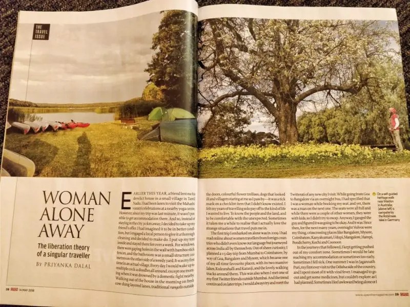 Recently I got the opportunity to write my first paid travel article. This was in OPEN magazine, May 2018, travel issue. They wanted to feature the joys and sorrows of a woman solo traveller. It was an interesting assignment because hitherto I had never written an actual summary of all my experiences solo travelling in India and the World! I would generally write about specific experiences, or do a year end review, but never really traced the journey from my first trip in 2009 until now.