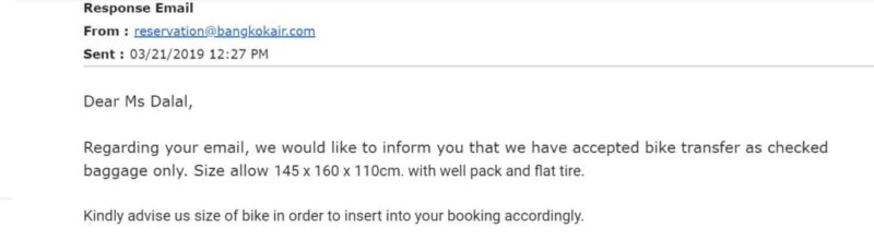 In general, I found the airlines of Thailand very friendly about cycle transport. They even had an offer of one free cycle transport with every passenger ticket – when I did this trip in Jan 2019. Even so, it is always good to confirm various details with them before booking your ticket. Just to be sure. The airline website may give some details – but it is good to confirm it. If there is a problem at the airport, you can show your personal communication, instead of simply the website details (which could be totally outdated).